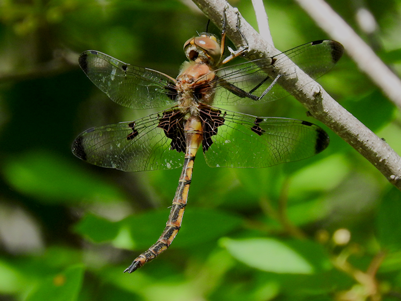 This is the largest and easiest baskettail to identify – even in flight – with its long abdomen and distinctly patterned wings. They are often seen patrolling over lakes, ponds and slow-moving rivers, or hunting high above fields and open meadows. They don’t often perch, but when they do the tip of the abdomen curls upward.