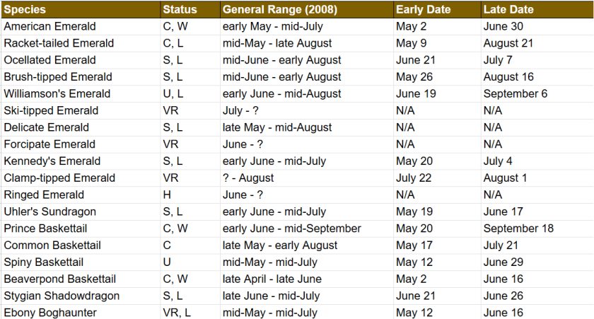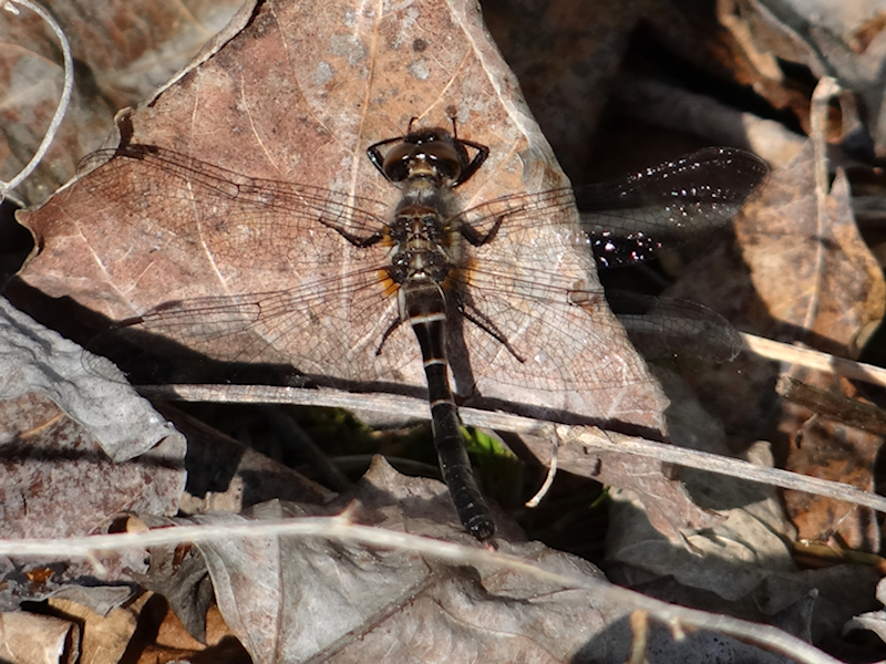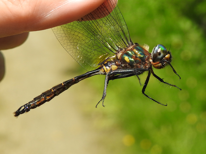 The Somatochlora emeralds, also known as the striped emeralds, are famed for their metallic bronze and green thoraces; many species have bright yellow spots on the sides of the thorax as well, which often become obscure with age. They are also frustratingly difficult to find, inhabiting inaccessible bogs, fens and remote forest streams rather than the vegetated ponds and marshes loved by skimmers. The Brush-tipped Emerald is the most common Somatochlora emerald in our area, easily found at Jack Pine Trail and Marlborough Forest in season. Other species seem to turn up in random spots when I least expect it; I don’t find them, they find me!