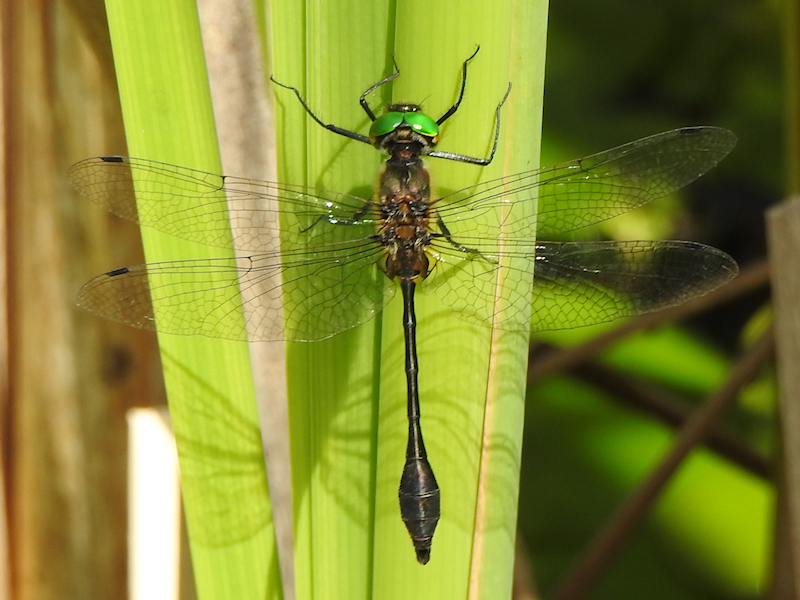 There are 18 species of emerald found in the Ottawa-Gatineau region, and except for a few common and widespread species, most members are difficult to find; you would be forgiven for thinking we only had five or six. Emeralds are named for their brilliant green eyes at maturity, characteristic of most species; however, some, such as the baskettails, have blue or brown eyes. Most emeralds have black bodies; some with small yellowish-orange rings or spots, others do not. The baskettails have prominent elongated yellow spots down the sides of the abdomen which distinguishes them in flight from other types of emeralds.