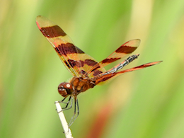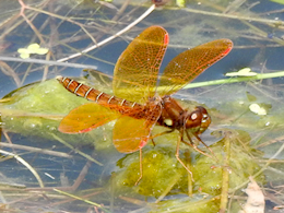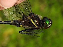 Last year I visited Jack Pine Trail in mid-July to look for Brush-tipped Emeralds. I didn’t find any, though I found three species of darners, which made me wonder if the emeralds were still present – I hadn’t recorded any there since 2019 for a myriad of reasons, including closures during the pandemic lockdowns and after the derecho of May 2022. The Brush-tipped Emerald belongs to genus Somatochlora, the striped emeralds, and is the smallest representative in our region. Somatochlora dragonflies are eagerly sought after by odonata enthusiasts, as they are uncommon to scarce in most human-populated areas, requiring special trips to remote peatlands, bogs, fens and swamps; and they are gorgeous, with their metallic green, yellow and black bodies and bright green eyes. They spend most of their time hunting on the wing and will land just often enough to give a dragon-hunter hope that they might get a good look or a photo of one perching naturally, though these emeralds often don’t often perch for very long – unless it’s on the side of a house during a drizzly day, or high up in a tree where they are shaded by the canopy. Their very unpredictability in where they will turn up makes it a delightful shock when you see one flying by.